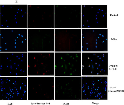 MCLR activates ER stress and autophagy in TM4 cells. (A) Representative immunoblots showed GRP78 proteins after different treatment. GAPDH was used as the control. Relative protein levels of GRP78 were shown from 4 independent experiments. (B) The mRNA expression of grp78 were evaluated by qRT-PCR (n = 4). (C) The mRNA expression of autophagy related genes atg5, atg12 and lc3b were evaluated by qRT-PCR (n = 4). (D) The expression levels of the autophagy markers ATG5, ATG12, LC3BⅠ and LC3BⅡ were analyzed by Western blot (n = 3). (E) Cell imaging was performed to analyze the colocalization of LysoTracker-stained acidified vesicles and LC3b-positive autophagosomes in control and MCLR-treated cells. Scale bar: 50 µm. *P < 0.05 significantly different from control group. ^P < 0.05 significantly different from 7.5 μg/mL MCLR. ▲P < 0.05 significantly different from 30 μg/mL MCLR. |