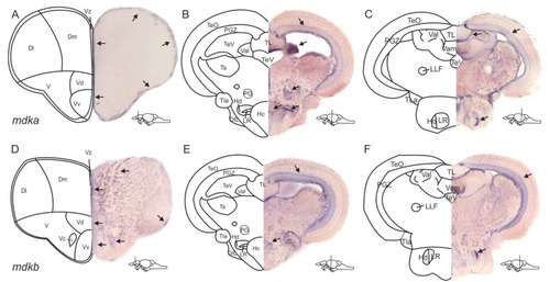 Expression patterns of the two paralogues mdka and mdkb differ in the adult zebrafish brain. (A–F) In situ hybridization (ISH) against mdka (A–C) and mdkb (D–F) on cross-sections through the zebrafish adult brain. mdka staining is visible along the ventricular layers of the dorsal and ventral telencephalic areas (A) and in the periventricular grey zone of the optic tectum and the lateral recess of the periventricular hypothalamus (B,C). In the diencephalon, mdka expression is additionally observed in the valvula cerebelli, the preglomerular nucleus, and the periventricular hypothalamus (B). mdkb expression is also detected in and outside of the ventricular layers of the telencephalon and spreads into the nuclei of the ventral telencephalon (D). In the diencephalon, it is also visible in the periventricular grey zone and the lateral recess (E,F). Abbreviations: D: dorsal telencephalic area; Dl: lateral zone of D; DIL: diffuse nuclei of the inferior lobe; Dm: medial zone of D; Hc: caudal zone of the periventricular hypothalamus; Hd: dorsal zone of the periventricular hypothalamus; LLF: lateral longitudinal fascicle; LR: lateral recess of the diencephalic ventricle; PG: preglomerular nucleus; PGZ: periventricular grey zone of TeO; TeO: optic tectum; TeV: telencephalic ventricle; TL: torus longitudinalis; TLa: torus lateralis; Ts: torus semicularis; V: ventral telencephalic area; Val: lateral division of the valvula cerebelli; Vam: medial division of the valvula cerebelli; Vc: central nucleus of V; Vd: dorsal nucleus of V; Vv: ventral nucleus of V; Vz: ventricular zone of the telencephalon. |