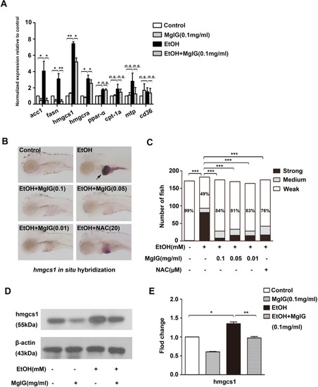 Effect of MgIG on alcohol-induced lipid metabolism dysfunction. a The relative acc1, fasn, hmgcs1, hmgcra, ppar-α, cpt-1, mtp, cd36 mRNA expression was analyzed by qRT-PCR in the livers of larvae treated with 0% or 350 mM alcohol, 0.1 mg ml−1 MgIG, or 350 mM alcohol + 0.1 mg ml−1 MgIG. *P < 0.05, **P < 0.01, ***P < 0.001, n.s.: no significant difference, by one-way ANOVA. b The expression of hmgcs1 was detected by whole-mount in situ hybridization. The typical pictures of each group were shown. c Quantification of hmgcs1 expression is categorized “strong”, “medium”, or “weak”. Bar chart indicates the percentages of each category in each group, and the percentages of larvae in “weak” category is noted. *P < 0.05, **P < 0.01, ***P < 0.001, n.s.: no significant difference, by Chi-Square test. d and e Protein expression of hmgcs1 was examined by western blot in larvae exposed to 0% or 350 mM alcohol, 0.1 mg ml−1 MgIG, or 350 mM alcohol + 0.1 mg ml−1 MgIG for 32 h, the degree of protein expression was normalized to β-actin. *P < 0.05, **P < 0.01, ***P < 0.001, by one-way ANOVA