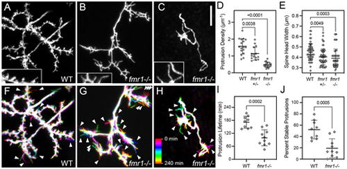 Reduced spine density, head width and stability in fmr1 mutants. (A) Native orientation maximum-projection image (dorsal side up, as in Fig. 1B) of the SM-targeted apical dendrites in an 8 dpf WT larva. (B,C) Native orientation views of the SM-targeted apical dendrites from two 8 dpf fmr1−/− mutant larvae. These are representative of mild (B) and severe (C) phenotypes observed in the fmr1 mutants. Insets in A-C are 1.5× magnified views of subregions containing spines. Note that the WT has both thin and wide heads, whereas the majority of spines on fmr1−/− PyrNs have thin heads. (D,E) Quantification of spine density and spine head width for WT, fmr1 heterozygotes (fmr1+/−) and fmr1 homozygotes (fmr1−/−). Both measurements were made using static single maximum-projection images as those shown in (A-C). Note significant decreases in both density and head width in the fmr1 mutants. One-way ANOVA with Tukey's multiple comparisons test was used to determine significance. Number of neurons analyzed for protrusion density analysis in WT, fmr1+/− and fmr1−/−: 17, 15 and 17, respectively. Number of spines and neurons (indicated in parentheses) analyzed for head width analysis in WT, fmr1+/− and fmr1−/−: 55 (4), 65 (6) and 58 (4), respectively. (F-H) Temporal color-coded image of dendrites in A-C during 4 h time-lapse recordings with image volumes acquired every 10 min. Color scale in H applies to all three images and indicates the images corresponding to each timepoint. Note increased number of transient protrusions (single-color label indicating that they were present during a single timepoint) in fmr1 mutants compared to WT (arrowheads). (I,J) Quantification of the protrusion lifetime and percentage of stable protrusions obtained from 4 h time-lapse recordings with a 10 min acquisition interval. On average, PyrN apical dendrites in fmr1 mutant larvae had reduced protrusion lifetimes (I), an effect largely due to a significant reduction in the percentage of stable protrusions present for the entire 4 h time-lapse imaging. Data are shown as mean±s.d. P-values were obtained using two-tailed unpaired t-tests. Analysis was performed on nine PyrNs in nine WT larvae and ten PyrNs in ten fmr1−/− mutant larvae. Scale bar: 5 µm. |