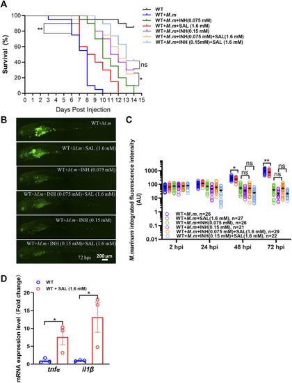 Combined treatment of SAL and INH significantly improve the survival of zebrafish during mycobacterial infection. |