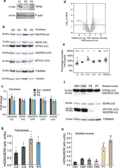 a Western blot detecting the TEFM protein in human dermal fibroblasts from patients 2 (P2) and 3 (P3). β-actin was used as a loading control. b Representative example of western blot analysis of NDUFB9 (complex I, cI), SDHA (complex II, cII), UQCRC2 (complex III, cIII), MTCO1 (complex IV, cIV), and ATP5A (complex V, cV) for fibroblasts from patients 2 (P2) and 3 (P3) and wild-type controls (C2 and C3). TOMM20 and Vinculin were used as loading controls. c Quantification of 3 western blot experiments as per (b). Data were statistically analyzed by two- tailed Student’s t-test. Error bars = mean ± 1 standard deviation, n = 3. d Volcano plot comparing whole-cell protein abundances for proteins quantified in P4 fibroblasts (n = 2 technical) relative to control fibroblasts (n = 4 biological). TEFM protein is highlighted in red. Significance lines were plotted at p-value <0.05 and log2 difference 0.585 (1.5-fold change equivalent) from two-sample t-test analysis. e Relative complex abundance of quantitative proteomics data plotted as a ratio of each subunit in TEFM/controls and represented as a percentage. The middle bar represents the mean value for the subunits in each complex, upper and lower bars represent 95% confidence interval of the mean value. A paired t-test calculated the significance between the control and patient for each complex. P values are indicated as ****p ≤ 0.0001; **p ≤ 0.01, *p ≤ 0.05, ns = not significant. Middle dotted line represents 100%, or no change between the TEFM and controls. f Representative example of western blot analysis of NDUFB8 (complex I, cI), SDHB (complex II, cII), UQCRC2 (complex III, cIII), MTCO2 (complex IV, cIV), and ATP5A (complex V, cV) for skeletal muscle samples from patients 1 (P1) and 2 (P2) and wild-type controls (CM1 and CM2). g mtDNA copy-number determination by qPCR of mtDNA fragments relative to the nuclear B2M gene for fibroblasts of P2 and P3 and the wild-type controls. Statistical analysis was carried out using a two-tailed student’s t-test. Error bars = mean ± 1 standard deviation, n = 6 (technical replicates, ns ≥ 0.05). h mtDNA copy-number determination by qPCR of mtDNA fragments relative to the nuclear B2M gene in skeletal muscle samples of P1 and P2 and wild-type controls. Statistical analysis was carried out using a two-tailed student’s t-test. Error bars = mean ± 1 standard deviation, n = 3 (technical replicates); *p ≤ 0.05; **p ≤ 0.01. Source data are provided as a Source Data file. |
