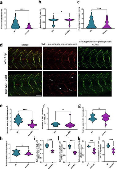 Early movement behaviours and neuromuscular junction morphology of tefm-MO and tefm (F0) zebrafish.