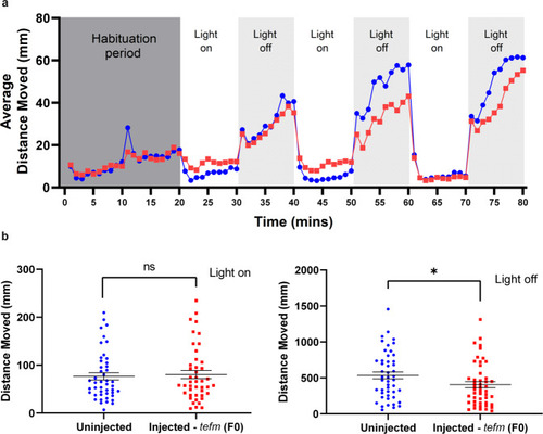 a Average distance moved (mm) of 5 dpf uninjected (blue circles) and injected - tefm (F0) (red squares) zebrafish exposed to three cycles of 10 min light on and 10 min light off after a 20-min habituation period. Each point represents 1 min, n = 48 uninjected and n = 48 injected - tefm (F0). b Total distance moved (mm) of 5 dpf uninjected (blue circles) and injected - tefm (F0) (red squares) zebrafish for the first 5-min of light on (left image) and light off (right image) periods from (a). Right image (light off), p = 0.0395, two-sided Mann–Whitney test, n = 48 uninjected and 48 injected – tefm (F0). Left image (light on), p = 0.5767, two-sided Mann–Whitney test. Error bars = mean ± SEM ns not significant, *p < 0.005. Source data are provided as a Source Data file. |