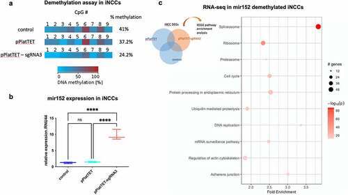 Figure 2. DNA methylation changes at mir152 DMRs results in mir152 expression changes and affects Spliceosomal, Ribosomal, and Adherens Junctions pathways. (a) A Cas9-based approach for target demethylation using the vector pPlatTET and mir152 specific single-guide RNA sequences (sgRNA3) for mir152 DMR in iNCC. sgRNA-3 efficiently reduces mir152 methylation in comparison to the empty vector transfection (pPlatTET) and non-transfected cells (control). Total percentage of methylation is represented with values at the right. (b) Targeted mir152 DNA hypomethylation by pPlatTET-sgRNA-3 (modified Cas9 coupled with the catalytic domain of TET1) induces significant mir152 overexpression in induced neural crest cells (iNCCs) revealed by RT-qPCR. Relative expression to endogenous control RNU44. Mann–Whitney’s test. (c) Enriched KEGG pathways found in RNA-seq analysis in mir152 demethylated iNCCs (pPlatTET-sgRNA3), overexpressing mir152. Higher fold enrichments are observed in Spliceosome and Adherens Junctions DEGs. |