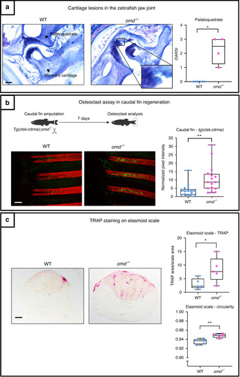 The mutant deficient for omd was generated through CRISPR/Cas 9. a Histology of the jaw joint was performed on 1-year-old zebrafish. The OARSI score of the palatoquadrate was attributed to the jaw joint stained with Toluidine blue with n = 4 for the WT and the mutant. The data were plotted as a box plot showing all points. Mann–Whitney test was performed with differences being considered significant at P values <0.05 (*P < 0.05). Scale bar = 200 µm. b The mutant line was crossed with the Tg(ctsk:Citrine) for the osteoclasts analysis during the caudal fin regeneration. The caudal fin of 1-year-old zebrafish was cut and the regenerating fin was observed after 7 days. The osteoclasts are represented in yellow-green from the ctsk:Citrine signal and the mineralized ray were stained with Alizarin red. The data were plotted as a box plot showing all points. The pixel intensity of the regenerating rays is plotted and normalized by the background intensity with n = 14 for the WT and n = 16 for the mutant from two independent experiments which were pooled to perform the unpaired Student’s t test with differences being considered significant at P values <0.05 (**P ≤ 0.01). Scale bar = 200 µm. c TRAP staining was performed on the elasmoid scales of 1.6-year-old zebrafish. The TRAP staining area was normalized with the total scale area. The TRAP staining and the circularity of the scales were assessed with ZFBONE—Fiji with n = 5 for the WT and the mutant and with 6 to 15 scales/zebrafish analyzed. Scale bar = 0.2 mm. The data were plotted as a box plot showing all points. Unpaired Student’s t test with differences being considered significant at P values <0.05 (*P < 0.05, **P ≤ 0.01)