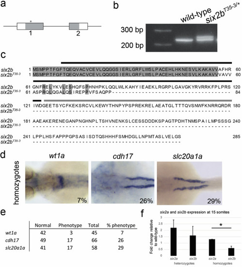 Stable CRISPR/Cas9 mutagenesis of six2b. (a) Schematic of mutagenesis target site. (b) PCR analysis of stable line six2bT35-3 genotype differentiating between heterozygous and wild-type animals. (c) Amino acid alignment of wild-type and mutant Six2b. The mutant line is predicted to lose most of the Six domain and the entire homeodomain and C-terminus. Black bar covers Six domain, grey bar covers homeodomain. (d) Whole mount in situ hybridization of homozygous mutant embryos at 48 hpf for wt1a, cdh17, and slc20a1a. Proximal tubule defects were detected in homozygous embryos. (e) Compiled data of proximal tubule morphology defects observed in six2b homozygous mutants. For comparison, heterozygous embryos are displayed in Supplemental Fig. 3 (f) qPCR of six2a and six2b in heterozygous and homozygous six2b mutants at 15 somites. Expression is relative to wild-type embryos at the same developmental stage. Error bars are standard error of the mean. *p-value = 0.03.