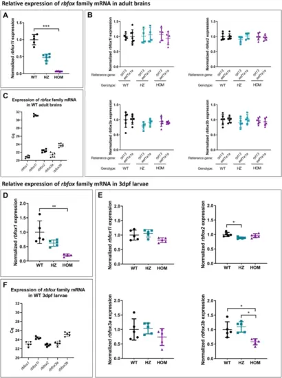 Relative expression of rbfox family mRNAs in adult brains and 3dpf larvae from the rbfox1sa15940 line. Adult brains: Relative brain expression of (A) rbfox1, (B) rbfox1l, rbfox2, rbfox3a and rbfox3b mRNA in adult brains. mRNA expression is normalised to the average expression of the mRNA in wild-type fish and to the reference housekeeping genes ribosomal protein L13a (rpl13) (A, B) or the eukaryotic translation elongation factor 1 alpha 1a (eef1a1a) (B). Kruskal-Wallis test followed by Dunn’s multiple comparison test. n = 5-7 WT, 5-7 HZ, 5-7 HOM. Mean ± SD. C Brain expression of the rbfox family mRNAs in adult wild-type zebrafish brains represented as the quantification cycle value for each gene. n = 7 WT, 7 HZ, 7 HOM. Mean ± SD. 3dpf larvae: Relative brain expression of (D) rbfox1, (E) rbfox1l, rbfox2, rbfox3a and rbfox3b mRNA in 3 dpf whole larvae. mRNA expression is normalised to the average expression of the mRNA in wild-type fish and to the reference housekeeping gene ubiquitin-conjugating enzyme E2A (ube2a). Kruskal-Wallis test followed by Dunn’s multiple comparison test. n = 5 WT, 5 HZ, 5 HOM. Mean ± SD. F Brain expression of the rbfox family mRNAs in 3 dpf wild-type larvae represented as the quantification cycle value for each gene. n = 5 WT, 5 HZ, 5 HOM. Mean ± SD. Each point represents the results from a pool of 10 larvae.