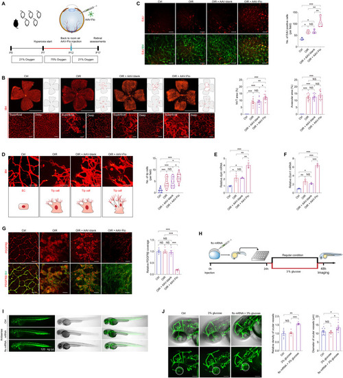 FTO promotes endothelial tip cell formation to facilitate neovascularization in mice and zebrafish. (A) Experimental scheme for (B–G) (B) Fluorescent staining of IB4 in retinal flat mounts originated from control, OIR mice without other treatment, and OIR mice intra-vitreal injected with AAV-blank/AAV-Fto at P17. n = 11 per group. Magnificent images are shown below to better visualize superficial and deep vascular plexuses. Gray dotted lines indicate the edge of the retina. Red lines suggest the avascular area. NVTs are represented by red dots. Representative images along with quantification results of NVT and avascular areas are shown. Scale bar: 2000 µm (up); 50 µm (below). (C) Fluorescent staining of EdU and IB4 in retinal flat mounts of control, OIR mice without other treatment, and OIR mice intra-vitreal injected with AAV-blank/AAV-Fto at P17. n = 4 per group. (D) Fluorescent staining of IB4 in retinal flat mounts of control, OIR mice without other treatment, and OIR mice intra-vitreal injected with AAV-blank/AAV-Fto at P17. n = 12 per group. Tip cells are indicated by yellow asterisks. Representative images along with quantification results of tip cell number per field are shown. Scale bar: 50 µm. (E, F) mRNA expression of tip cell markers Apln (E) and Esm1 (F) detected by qPCR in neural retinas of control, OIR mice without other treatment, and OIR mice intra-vitreal injected with AAV-blank/AAV-Fto at P17. n = 3 per group. (G) Immunofluorescence staining of PDGFRβ and IB4 in retinal flat mounts of control, OIR mice without other treatment, and OIR mice intra-vitreal injected with distinct virus at P17. n = 4 per group. (H) Experimental scheme for (I, J). (I) Truncal vasculatures demonstrated by endogenous EGFP and morphological structures of control and zebrafish injected with antisense or fto mRNA. n = 3 per group. (J) Ocular vasculatures shown by endogenous EGFP and morphological structures of control and zebrafish receiving indicated treatments. Ocular vasculatures are indicated by white circles. Representative images along with quantification results of ocular vessel density (n = 5 per group) and diameters (n = 8–10 per group) are shown. Scale bar: 100 µm. Data information: Data represent different numbers (n) of biological replicates. Data are shown as mean ± SEM. One-way ANOVA followed by Bonferroni’s test is used. NS: not significant (p > 0.05); *p < 0.05; **p < 0.01; and ***p < 0.001. Source data are available online for this figure.
