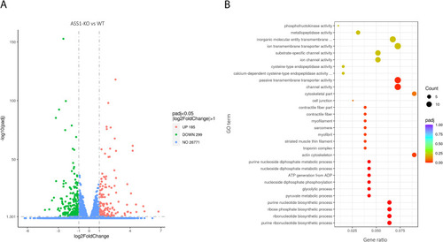 ASS1 deficiency is associated with distinct alterations of gene expression mainly involving (ribo)nucleotide metabolism and cerebral channels/receptors. Total RNA of mock- or MO-injected zebrafish larvae was extracted at developmental age 1 dpf using TRIzol reagent. RNA sequencing was commercially perfomed at Novogene Company Ltd. (UK) according to the service provider's protocols. (A) Volcano plot illustrating differentially expressed genes in ASS1-deficient (ASS1-KO) versus wildtype (WT) zebrafish larvae. Data are expressed in log2FoldChange (abscissa) and -log10(padj) (ordinate). Values for each gene with log2(FoldChange)| ≥ 1 and padj ≤0.05 were considered significant. Whereas the majority of 26,771 genes was not altered between both cohorts, 484 were significantly differentially expressed in ASS1-KO larvae with 185 genes being upregualted and 299 genes being downregulated. (B) Scatter plot of GO enrichment analysis in ASS1-KO zebrafish larvae depicting the ratio of the number of differentially expressed genes linked with a specific GO term to the total number of differential genes (abscissa) for the most significantly enriched GO terms (ordinate). The size of a point represents the number of genes annotated to a specific GO term, and the color grading from red to purple represents the level of significance of enrichment (padj). Alterations in gene expression in ASS1-deficient zebrafish larvae clustered in distinct (metabolic) pathways predominantly involving (ribo)nucleotide metabolism and cerebral channel/receptor expression. (For interpretation of the references to color in this figure legend, the reader is referred to the web version of this article.) |