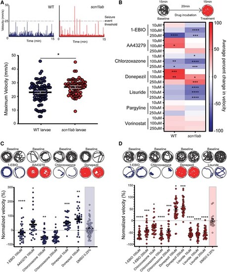 Behavioral phenotypic screening of candidate ASMs in WT and scn1lab larvae. (A) Representative baseline swim velocities (mm/s) over time for 5 dpf WT and scn1lab mutant larvae. Threshold for behavioral seizure events indicated by dotted line (28 mm/s). Scn1lab larvae (N = 60 across 3 replicates) have significantly (P = 0.014) higher maximum velocities on average compared to WTs (N = 70 across 3 replicates), all larvae are represented as individual data points. (B) Timeline for behavioral tracking acquisition (top). Heatmap of the percent change in average swim velocity from baseline after treatment with candidate ASMs at three different concentrations. Significant changes from vehicle control are indicated by stars with an N = 30 or 40 per condition across minimum three trials for WT and scn1lab larvae. (C) Behavioral tracking plots for WT larvae showing baseline activity followed by ASM treatment for drugs that caused a significant change in swimming velocity compared to DMSO controls. The plot below highlights the normalized velocity in percent, after ASM treatment for each larvae recorded. AA43279 significantly increased swim velocity in WT larvae at 100 µM (N = 40 across three replicates, P < 0.0001). (D) Behavioral tracking plots for scn1lab larvae showing baseline activity followed by ASM treatment for drugs that caused a significant change in swimming velocity compared to DMSO controls. Donepezil increased swim velocities for scn1lab larvae (N = 40 across 4 replicates, P < 0.01). 1-EBIO, chlorzoxazone and lisuride significantly reduced swim velocities (N = 30–40 across 3–4 replicates, P < 0.05–0.0001). The plot below highlights the normalized velocity in percent, after ASM treatment for each larvae recorded. An unpaired t-test or ANOVA was performed for statistical analysis, P < 0.05 = *, P < 0.005 = **, P < 0.0005 = ***, P < 0.0001 = ****.