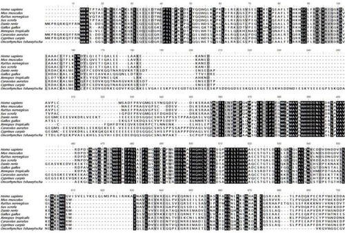Multiple sequence alignment of FTO from different species and isoforms. Multiple sequence alignments were conducted using Clustal Omega (www.ebi.ac.uk). The name of the species is given on the left side of the alignment and the number of amino acids in the peptide is provided above the alignment. The black background indicates conserved amino acid residues, and the gray background indicates similar amino acid residues. Species names and GenBank (www.ncbi.nim.nih.gov) accession numbers used in the alignment are as follows; Homo sapiens FTO (NP_001073901.1), Mus musculus FTO (NP_036066), Rattus norvegicus FTO (XP_038953492.1), Sus scrofa FTO (NP_001106162.1) Xenopus tropicalis FTO(NP_001017273.1), Gallus gallus FTO (NP_001172076.1), Danio rerio FTO (XP_001345910.4), Carassius auratus FTO (XP_026123363.1) Cyprinus carpio FTO(XP_042583804.1), Oncorhynchus tshawytscha FTO(XP_042186975.1). |