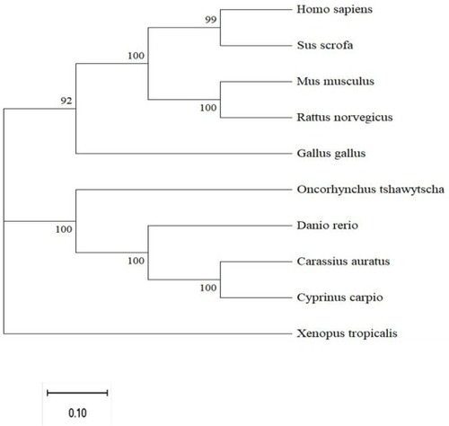 Phylogenetic analysis of FTO amino acid sequences. A phylogenetic tree based on the amino acid sequences of FTO was constructed by MEGA 11 program using the Neighbor-Joining method. The number at each node indicates the bootstrap value obtained for 1000 replicates. The scale bar shows genetic distance. GenBank accession numbers: Homo sapiens FTO (NP_001073901.1), Mus musculus FTO (NP_036066), Rattus norvegicus FTO (XP_038953492.1), Sus scrofa FTO(NP_001106162.1) Xenopus tropicalis FTO(NP_001017273.1), Gallus gallus FTO(NP_001172076.1), Danio rerio FTO (XP_001345910.4), Carassius auratus FTO (XP_026123363.1) Cyprinus carpio FTO(XP_042583804.1), Oncorhynchus tshawytscha FTO(XP_042186975.1). |