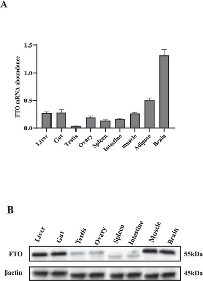 Tissue distribution of FTO. (A) FTO mRNA abundance in different tissues. (B) Western blot analysis of FTO protein in different tissues. The amount of FTO mRNA abundance was normalized to the amount of β-actin. Bars present the mean ± SEM (n = 6 zebrafish). |