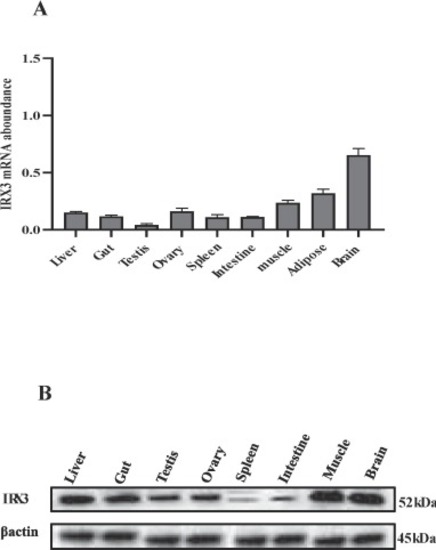 Tissue distribution of IRX3. (A) IRX3 mRNA abundance in different tissues. (B) Western blot analysis of IRX3 protein levels in different tissues. The amount of IRX3 mRNA abundance was normalized to the amount of β-actin. Bars present the mean ± SEM (n = 6 zebrafish). |