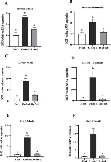 IRX3 mRNA abundance in the metabolic tissues of male and female zebrafish during 7-day fasting, and 24 h post-feeding (refed group). Brain (A–B), liver (C–D) and gut (E,F). FTO mRNA expression was normalized to β-actin and 18S. Different letters above bars indicate significant differences between groups (one-way ANOVA followed by Student-Newman-Keul’s post-hoc test, P < 0.05). Asterisks represent significant differences among the groups at the same time point (Student’s t-test; (*p < 0.05, **p < 0.01, ***p < 0.001 ****p < 0.0001). Data are expressed as mean ± SEM (n = 6 zebrafish/group). |