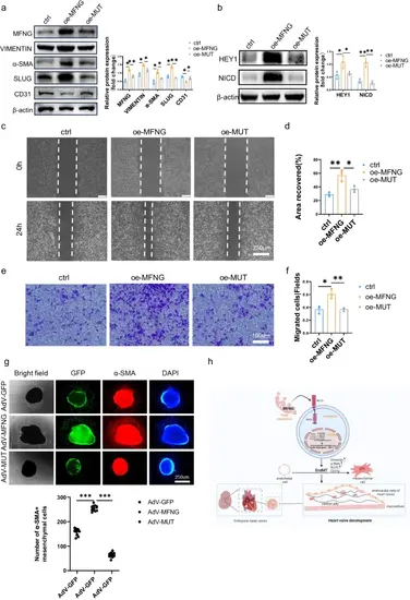 MFNG mutation blocked EndMT by inhibiting Notch pathway. a, b To delve deeper, we conducted an examination of the relative protein expression of MFNG, EndMT-related markers, and molecules associated with the Notch pathway in HUVECs subjected to various treatments, with Western blot analysis. The intensity of protein expression was quantified using ImageJ software, normalized to β-actin expression. Additionally, we conducted representative experiments, such as cell c wound healing assays and e transwell assays, which provided visual evidence that the MFNG variant had a restraining effect on the migration capacity of HUVECs. Quantitative statistics for cell wound d healing assays and f transwell assays (f) were also included. It is worth noting that all data presented here were derived from three independently repeated biological experiments. g Bright-field images demonstrate mesenchymal cell outgrowth from adenovirus-infected explants. GFP fluorescent images represent all cells infected with adenovirus. The mesenchymal cells migrating from endothelial cells were marked with the α-SMA antibody (red). The cell nuclei were stained with DAPI, which produces a blue signal. The quantitative analysis results demonstrate a significant reduction in the number of migrating mesenchymal cells in the presence of the MFNG mutation. High magnification results are shown in Fig. SI3. h A schematic model of the mechanisms of MFNG-mediated heart valve formation. MFNG exerts a positive regulatory influence on the EndMT process by enhancing the activity of the Notch signalling pathway, thereby promoting the heart valve development |