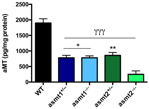 Melatonin concentration in zebrafish larvae. asmt1+/−, asmt1−/−, and asmt2+/− showed a significant reduction of 50% compared to WT. asmt2 −/− revealed an even greater decrease compared to the WT and the other mutant lines. Data are presented as mean ± SEM ( |