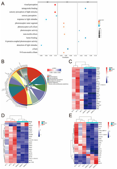 Pathways and differential gene expression associated with cdh23 knockout in relation to photoreceptor degeneration. (A) Gene Ontology (GO) enrichment analysis of differentially expressed genes was conducted across three categories: biological process (BP), cellular component (CC), and molecular function (MF). The y-axis represents enrichment of each GO term, with redder color indicating higher significance, and size of circle representing number of genes enriched in pathway, with larger circles indicating higher number of enriched genes. (B) KEGG pathway enrichment analysis of differentially expressed genes was also performed, with p-adjust value used to assess the statistical significance of each pathway. Smaller p-adjust values indicate greater significance of enrichment. (CE) Heatmap illustrating differential expression of genes involved in phototransduction, retinol metabolism, and purine metabolism pathways is presented. Vertical axis represents genes, and horizontal axis represents sample groups and control groups, with red indicating up-regulated genes and blue indicating down-regulated genes.