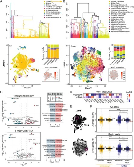 Single‐cell transcriptomes of YTHDF2 zebrafish models. (A) Hierarchical clustering of 19,141 cells across ythdf2 knockdown crispant and YTHDF2 mRNA overexpression models and associated controls (scramble gRNA and eGFP mRNA) into broad cell types based on the expression of gene markers. Dendrograms were created to cluster cells with similar expression profiles and visualized via UMAP plots, with colors indicating assigned cluster IDs. The proportion of cells assigned to each cluster per model is a percentage of total cells indicated as a barplot. Cells with ythdf2 transcripts are colored red based on a continuous scale of natural log normalized expression (Hao et al. 2024). (B) Hierarchical sub‐clustering of 12,066 brain cells across all conditions into 18 cell types based on the expression of gene markers. Proportion of cells and ythdf2 expression are also plotted, as described in (A) for the brain sub cluster. (C) Volcano plots showing DEGs across all cell‐types within ythdf2 knockdown (top) and YTHDF2 mRNA overexpression (bottom) models relative to controls, with fold change (FC) plotted versus adjusted p value. DEGs with absolute log2FC ≥ 1 and adjusted p value ≤ 0.05 are colored (upregulated as red, downregulated as blue). A subset of significantly enriched gene ontologies (adjusted p value ≤ 0.01) are depicted as bar plots for upregulated and downregulated DEGs next to each respective volcano plot for knockdown and overexpression models. (D) Average log2FC for 15 significant FMRP‐target DEGs identified in knockdown or overexpression models with respect to controls are shown. (E) Joint kernel density estimation was calculated from all 15 FMRP‐target DEGs (Nebulosa) highlighting higher expression within a sub‐type of brain cells. (F) The average log2FC per expressed gene (0.01% of cells) was plotted across all cells and brain cells (see Section 2) for all and 675 FMRP‐target genes expressed in both groups for the ythdf2 knockdown and YTHDF2 mRNA zebrafish models. Comparisons were made using t tests either paired (between models) or unpaired (within models). Median fold changes versus respective controls (scrambled for knockdown and eGFP for mRNA) are indicated next to plots. All p values in this figure are represented as: ≤ 0.05*, ≤ 0.01**, < 0.001***.