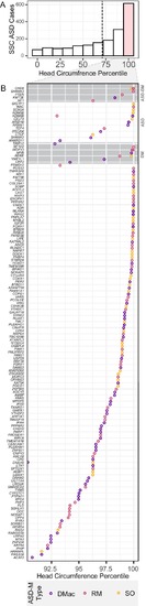 Macrocephaly level of candidate ASD‐DM and ASD‐M genes. (A) A histogram representing the number of SSC probands v. head circumference percentiles shows a skew toward larger head‐sizes compared to age‐ and sex‐matched typically developing children. The red bar designates those meeting the criteria for macrocephaly. The dashed line represents the distribution mean. (B) ASD‐DM and ASD‐M genes listed by their identified proband's head circumference percentiles show genes previously associated with ASD‐DM (first gray quadrant) are more likely to be associated with a higher head circumference percentiles than genes previously associated with autism (second white quadrant) and DM (third gray quadrant) alone. Color represents the macrocephaly type. DMac, disproportionate macrocephaly; RM, relative macrocephaly; SO, somatic overgrowth. |