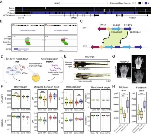 Disrupting ythdf2 in zebrafish is associated with head and brain size phenotypes. (A) Copy‐number‐estimate plot (QuickMer2) using sequencing data from the APP proband harboring a de novo 109‐kb duplication on chromosome 1 compared with their parents harboring two diploid copies. (B) IGV plot showing discordant reads in the APP proband supporting a tandem duplication. (C) An illustration of the tandem duplication on chromosome 1 in an APP proband encompassing GMEB1 and all but the last exon of YTHDF2. (D) Cartoon depicting the CRISPR‐based knockdown (KD) and overexpression using in vitro transcribed mRNAs (mRNA) experimental paradigms by injection of nucleic acid into single‐cell zebrafish embryos. (E) Morphometric measurements were produced using VAST platform images and automated feature extraction via FishInspector (Teixidó et al. 2019) of body length, distance between the eyes, telencephalon width, and head‐trunk angle. (F) Features were quantified in 3 dpf larvae by comparing ythdf2 knockdown (KD, n = 37) versus scrambled gRNA controls (Cont., n = 34) and YTHDF2 overexpression (mRNA, n = 55) versus injection controls (Cont., n = 55) (top). Similar comparisons were made for gmeb1 KD (n = 33) versus scrambled gRNA controls (n = 34) and GMEB1 mRNA (n = 26) vs. injection controls (n = 26) (bottom). (G) Knockdown and mRNA injected zebrafish harboring a pan neuronal marker (HuC:eGFP) reveal brain size differences at 3 dpf. Representative control, knockdown, and mRNA injected zebrafish images of transgenic larvae. Scale bar is 100 μm. (H) ythdf2 knockdown embryos show significantly decreased midbrain volume (Wilcoxon t test, p value = 0.006). YTHDF2 mRNA‐injected embryos show both significantly increased midbrain (Wilcoxon t test, p value = 0.014) and forebrain (Wilcoxon t test, p value = 0.001). All p values are adjusted for multiple‐testing using Bonferroni correction and only significant comparisons depicted as: ≤ 0.05*, ≤ 0.01**, ≤ 0.001***.