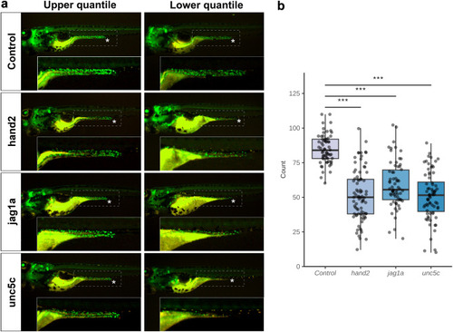 CRISPR/Cas9 knockout of hand2, jag1a, and unc5c impaired ENS development and resulted in decreased enteric neuronal number. (a) Representative images of the wild type zebrafish (control), the hand2, jag1a and unc5c crispant zebrafish with number of neurons above the upper (left) and below the lower quantile (right) are shown. The image at the bottom right panel represents the zoomed-in view (indicated by the dotted box) visualizing the Kaede-expressing enteric neurons (green dots) in the intestine. Asterisk (∗) indicates end of the gut tube (anal pore). (b) Significant reduction in the number of enteric neurons in hand2 (n = 80), jag1a (n = 66) and unc5c (n = 72) crispants compared to wild type control fish (n = 63). ∗∗∗ T-test p < 0.001.