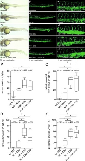 Sema3F is essential for the proper angiogenesis in zebrafish. Zebrafish embryos in 1- to 2-cell stage were injected with Sema3F-specific morpholino (Sema3Fa-(MO1-S3fa), Sema3Fb-morpholino (MO1-S3fb), or both). Uninjected and control-morpholino-injected embryos served as controls. (A-O) Representative pictures of zebrafish embryos in the transmitted light and fluorescent light microscopy were taken on 2nd day post fertilization (dpf). (P) On the 1st dpf, Sema3F morphants showed a higher mortality rate than zebrafish injected with control morpholino. On the 2nd dpf the larvae were dechorionated and examined for phenotypes. Sema3F morphants showed typical vessel ectasia in the distal trunk (Q), intersegmental vessel (ISV) malformations (R), as well as increased occurrence of pericardial effusions (S). All these features were observed most frequently in Sema3Fb morphants. (Q-R) The data presented are from 4 independent experiments, the total number (n) of zebrafish is shown in the figures. All box plots extend from the 25th to the 75th percentile, with the median marked. Whiskers extend from the 10th to the 90th percentile. Results were analyzed by one-way ANOVA followed by Bonferroni's multiple comparison test: *p < 0.05.