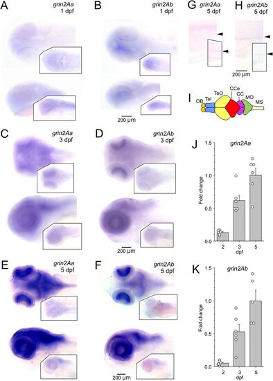Expression of grin2Aa and grin2Ab in the zebrafish nervous system. Whole-mount ISH of grin2Aa and grin2Ab at 1 dpf (A, B), 3 dpf (C, D), and 5 dpf (E, F) showing dorsal (top) and lateral (bottom) views. A, C, E, Insets, sense probes of grin2Aa. B, D, F, Insets, sense probes of grin2Ab. G, H, Lateral view of the trunk at 5 dpf for grin2Aa (G) and grin2Ab (H). The position of the spinal cord is indicated by arrows. Insets, Sense probes of grin2Aa and grin2Ab. I, Simplified representation of the zebrafish central nervous system and its major structures. Adapted from Wullimann et al. (1996); CC, crista cerebellaris; CCe, corpus cerebelli; MO, medulla oblongata; MS, medulla spinalis; OB, olfactory bulb; Tel, telencephalon; TeO, tectum opticum. J, K, Relative expression levels of grin2Aa and grin2Ab mRNA at 2 dpf (n = 6; 6), 3 dpf (n = 6; 6), and 5 dpf (n = 6; 5) in the head of zebrafish larvae analyzed using RT-qPCR. Results are normalized to the corresponding gene expression at 5 dpf. For mRNA expression levels of grin1 and grin2B paralogs in the zebrafish nervous system, see Extended Data Figure 2-1.