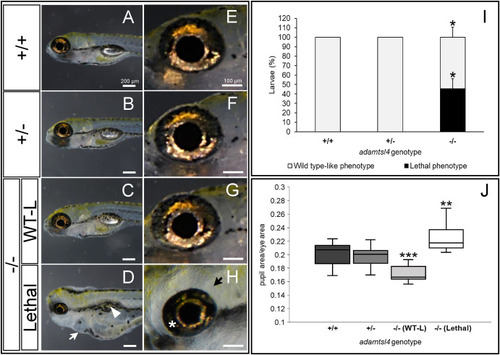 Morphological characterization of F3 adamtsl4-KO larvae at 6 dpf. Representative photographs of wild type (+/+), heterozygous (±), wild type-like knockout (−/− (WT-L)), and lethal knockout (−/− (Lethal)) larvae are shown. A-D. General body morphology. White arrow: pericardial edema; White arrowhead: abnormal swim bladder. E-H. Magnification of ocular structures. I. Quantification of the percentage of KO larvae displaying wild type-like and lethal phenotypes. The data represent three independent replicates with the following total sample sizes: wild type, n = 31; heterozygous, n = 59; mutant homozygous, n = 23. J. Quantification of pupil area normalized to total eye area. The following sample sizes were used for eyes: wild type, n = 24; heterozygous, n = 24; homozygous, n = 24. ∗: p < 0.05; ∗∗: p < 0.01; ∗∗∗: p < 0.001. |