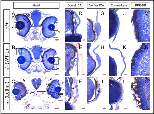 Histological analysis of toluidine blue-stained tissue sections from adamtsl4 KO zebrafish larvae (6 dpf). Transverse semithin tissue sections (500 nm) were prepared as described in the Materials and Methods section. Representative photographs of wild type (+/+), wild type-like KO (−/− (WT-L)) and lethal KO (−/− (Lethal)) larvae are shown. A-C. Tissue sections from the central part of the eyeball (note the presence of the optic nerve (ON)); rectangles indicate areas magnified in subsequent panels. D-F. Dorsal iridocorneal angle (ICA). G-I. Ventral ICA. J-L. Cornea and lens. M-O. Retinal pigmented epithelium (RPE)-neuroretina (NR) interphase. Asterisks: abnormal intercellular separations; black arrows: periocular edema; black arrowhead: increased xantophores; white arrows: amorphous deposits in the RPE. (For interpretation of the references to colour in this figure legend, the reader is referred to the Web version of this article.) |