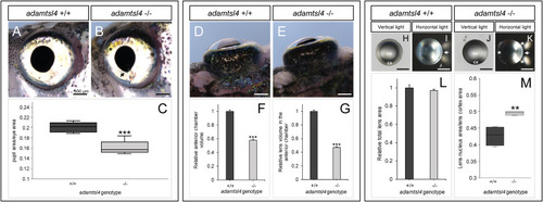 Morphological phenotype characterization of 5 months F3 adamtsl4-KO zebrafish. A-B. Lateral morphology of the eye. (C) Quantification of pupil area relative to the eye area. Sample size: wild-type, n = 5; adamtsl4-KO, n = 9. D-E. Dorsal morphology of the eyes. F. Quantification of anterior chamber volume. G. Quantification of the visible lens volume within the anterior chamber. Sample size in F–G: wild-type, n = 20; adamtsl4-KO, n = 72. H-K. Lens morphology and light transmission. L. Quantification of total lens area. M. Quantification of lens nucleus area relative to the cortex area. Sample sizes: wild-type, n = 4; adamtsl4-KO, n = . ∗∗: p < 0.01; ∗∗∗: p < 0.001. Black asterisk: increased xanthophores. Black arrow: irregular pupil morphology. White asterisk: impaired light transmission in the lens. White arrow: direction of light. Cx, cortex; nu, nucleus. |