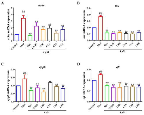 The effects of cyanidin derivatives on the transcriptional alterations of AD-related genes of AD zebrafish. ( |