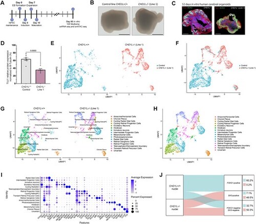 Loss of CHD1L perturbs forebrain cell-fate determination in hCO. (A) Schematic of hCO generation from hiPSC. (B) Pictures of 60 DIV hCO derived from CHD1L+/+ and the two CHD1L−/− cell lines. Scale bars: 1 mm. (C) Immunostaining against TUJ1 (neuronal cytoskeleton marker) and SOX2 (neural progenitor cells) on 52 DIV hCO either CHD1L−/− (Mutant Line 1) or control. Scale bars: 500 μm. (D) Semi-quantitative analysis of TUJ1 protein expression in CHD1L−/− (Mutant Line 1) and control hCO normalized with β-Tubulin. Data shown as mean ± SEM of 8 hCO per condition; representative of N = 2 batches of generated organoids; Student’s t-test. (E) Uniform Manifold Approximation and Projection (UMAP) projection of CHD1L+/+ and CHD1L−/- hCO cells colored by condition. N = 6 organoids per condition, 2385 cells CHD1L+/+ and 1634 cells CHD1L−/− sequenced. (F) UMAP representation of CHD1L+/+ and CHD1L−/− (Mutant Line 1) multiome analysis combined and integrated on the same graph. N = 12 organoids, 4019 cells. (G) UMAP representation of CHD1L+/+ and CHD1L−/− (Mutant Line 1) hCO multiome analysis on the same graph. Clusters based on cell identities are indicated. (H) UMAP representation of CHD1L+/+ and CHD1L−/− (Mutant Line 1) hCO multiome analysis combined and integrated on the same graph. Clusters based on cell identities are indicated. (I) Dot plot representing key cell type markers and their levels of gene expression within cerebral organoids’ cell clusters. Dot size indicates the proportion of cells per cluster expressing the corresponding gene and color is associated to the average expression level of the corresponding gene per cluster. (J) Sankey diagram visualization of the proportion of nuclei positive for either the ventral telencephalic marker FOXG1, or the eye territory marker SIX3 (normalized expression >1) in CHD1L+/+ and CHD1L−/− hCO. Percentage of nuclei is indicated for each category. |