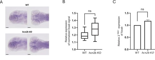 Analysis of fosab expression. A. Whole-mount in situ hybridization of fosab in WT and hcn2b KO larvae shows uniform expression throughout the brain. No region-specific differences were observed. Scale bar: 100 μm. B. Quantification of normalized signal intensity of WISH (n = 7 larvae per group) revealed no significant difference between WT and hcn2b KO (unpaired t-test, p > 0.05). C. RT-qPCR analysis of fosab expression using the ΔΔCt method (n = 4 biological replicates per group) showed a non-significant trend toward increased expression in hcn2b KO mutants compared to WT (unpaired t-test, p > 0.05).