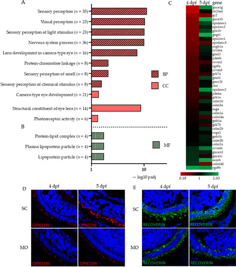 Delivery of translation‐blocking morpholino oligos (MO) targeting rs1a and rs1b mRNA results in significant downregulation of visual perception and camera‐type eye development at 96 h post‐fertilization (hpf), as well as impaired photoreceptor development. Following RNA sequencing, gene ontology (GO) enrichment analyses were performed. A: All significantly downregulated GO terms for biological processes (BP; blue bars) and molecular function (MF; red bars). No terms for cellular components were significantly enriched in differentially expressed genes (DEGs). n refers to the number of DEGs mapped to the term. B: All upregulated GO terms for cellular components (CC; green bars). MF and BP did not yield terms significantly enriched in DEGs. n refers to the number of DEGs mapped to the term. C: Heatmap of phototransduction‐related genes (derived from Kyoto Encyclopedia of Genes and Genomes [KEGG] pathway). Red and green colors indicate respectively down‐ and upregulation of the genes in MO compared to scrambled (SC). The scale ranges from strongly downregulated (fold change 0.18) to slightly upregulated (fold change 2.0). D: Immunofluorescent staining of blue cone pigment small‐wavelength sensitive opsin (OPN1SW) in 4 and 5 day‐old SC‐ and MO‐injected zebrafish. Padj = adjusted p‐value. Dpf = days post‐fertilization.