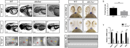 ddx3xa knockout induces early cardiac malformation and dysfunction in zebrafish. (A–H) Phenotypic analysis of zebrafish hearts. (A) Normal cardiac phenotype in wild-type (WT) zebrafish at 48 hpf. (B–D) Cardiac phenotypes in ddx3xa−/− zebrafish at 48 hpf. (E) Normal cardiac phenotype in WT zebrafish at 72 hpf. (F–H) Cardiac phenotypes in ddx3xa−/− zebrafish at 72 hpf. Scale bar: 500 µm (applies to A–H). (I) Dorsal view of the heart in WT zebrafish at 72 hpf. (J–L) Dorsal views of hearts in ddx3xa−/− zebrafish at 72 hpf. Scale bar: 25 µm (applies to I–L). (M–N) Whole-mount in situ hybridization (WISH) with vmhc probe at 48 hpf. ddx3xa−/− larvae display irregular ventricular contours compared to WT (scale bar: 250 μm). (M)vmhc WISH in WT zebrafish at 48 hpf. (N) vmhc WISH in ddx3xa−/− zebrafish at 48 hpf. (O–P)myl7 probe WISH at 72 hpf. ddx3xa−/− larvae exhibit defective atrioventricular looping and atrial hypoplasia compared to WT (scale bar: 250 μm). (O)myl7 WISH in WT zebrafish at 72 hpf. (P)myl7 WISH in ddx3xa−/− zebrafish at 72 hpf. (Q–T) Heartbeat analysis in WT and ddx3xa−/− zebrafish at 72 hpf. (Q) Representative heartbeat trace of WT zebrafish at 72 hpf. (R) Representative heartbeat trace of ddx3xa−/− zebrafish at 72 hpf. (S) Statistical analysis of heart rate (n = 3; ***P < 0.001). (T) qRT-PCR analysis of myh7, nkx2.5, nppa, and tbx2 transcript levels in WT and ddx3xa−/− larvae at 72 hpf (n = 3; **P < 0.01, ***P < 0.001).
