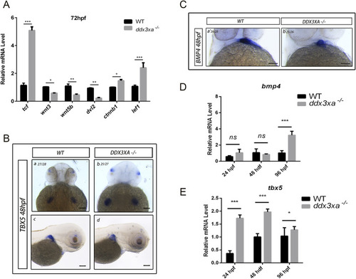 Wnt signaling disruption in ddx3xa−/− zebrafish. (A) Expression of key Wnt signaling components in ddx3xa−/− larvae at 72 hpf by qRT-PCR (n = 3; *p < 0.05, **p < 0.01, ***p < 0.001 vs. WT). (B) Whole-mount in situ hybridization (WISH) with tbx5 probe at 48 hpf. Numbers indicate identically stained embryos/total processed. Scale bar: 250 μm (applies to B–C). (a) WT dorsal view; (b) ddx3xa−/− dorsal view; (C) WT lateral view; (D)ddx3xa−/− lateral view. (C) WISH with bmp4 probe at 48 hpf. (a) WT ventral view; (b) ddx3xa−/− ventral view. (D)bmp4 expression levels in ddx3xa−/− embryos at 24, 48, and 96 hpf by qRT-PCR (n = 3; ***p < 0.001 vs. WT; ns: nonsignificant). (E)tbx5 expression levels in ddx3xa−/− embryos at 24, 48, and 96 hpf by qRT-PCR (n = 3; *p < 0.05, ***p < 0.001 vs. WT).