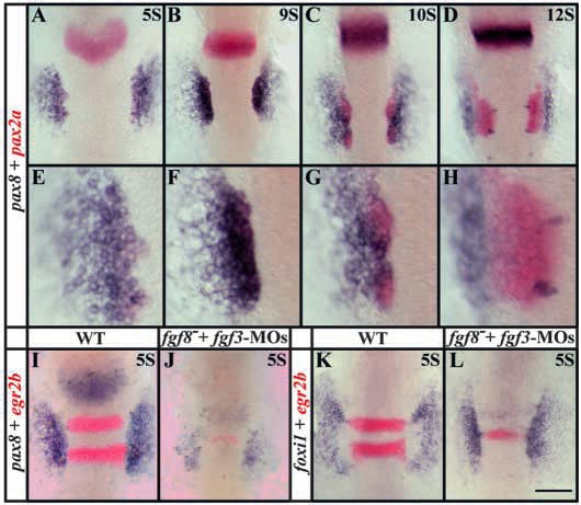 Fig. 1 pax8 expression partially overlaps with pax2a in the preotic region and, like pax2a, depends upon Fgf signaling. Expression domains of pax8, (blue) and pax2a (red) coincide in the preotic region (A-C) but diverge after formation of the placode (D). At five-somite (A,E) to nine-somite (B,F) stages, the pax8 domain encompasses pax2a but also extends further laterally. By the 10- somite stage, when the otic placode is forming, pax8 expression diminishes in the placode (C,G) and is completely absent from the placode by the 12-somite stage (D,H) but is obvious just lateral to the placode. The bilateral pairs of medial blue spots in D,H are hindbrain neurons that express pax8. (E-H) High-magnification views of embryos shown in A-D. (I,J) Fgf3 and Fgf8 depletion leads to a severe reduction of pax8 expression at the five-somite stage but not to complete loss. In Fgf3- and Fgf8-depleted embryos, only weak expression can be detected (J) compared with uninjected wild-type embryos (I). Expression of egr2b (red) in the hindbrain (I) is also reduced when Fgf signals are lost (J) (Maves et al., 2002). (K,L) foxi1 is not dependent on the Fgf3 and Fgf8 signal. In wildtype embryos at the five-somite stage, foxi1 is expressed in two patches lateral to the neural plate (K) and depletion of Fgf3 and Fgf8 has no obvious effect on foxi1 expression (L). Dorsal views, anterior towards the top. Scale bar: 120 μm for A-D,I-L; 40 μm for E-H.