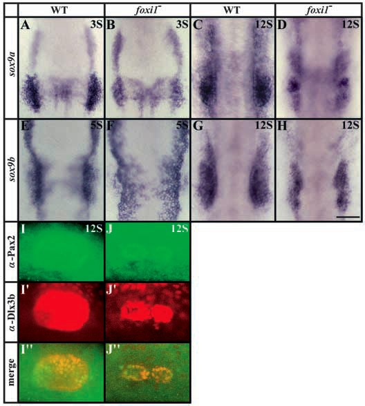Fig. 6 Foxi1 is required for patterning of otic precursors. The expression pattern of sox9a (A-D), sox9b (E-H), Dlx3b and Pax2 (I,J) are perturbed in foxi1- mutants. At the three-somite stage, sox9a expression is strong in cells of the future otic placode in wild-type embryos (A) but severely reduced in foxi1- mutants (B). At the 12- somite stage, sox9a is expressed throughout the otic placode in wild-type embryos (C) in contrast to foxi1- mutants of the same age that have only a few cells expressing sox9a (D). (E-H) Loss of foxi1 affects sox9b differently. At the five-somite stage, sox9b expression is reduced in the preotic region in foxi1- mutants (F) compared with wild-type embryos (E) but by the 12-somite stage, sox9b expression in foxi1- mutants has recovered (H), although not to wild-type levels (G). (I-J′) Dlx3b and Pax2 proteins coincide in the otic region. In wild-type embryos at the 12-somite stage, Dlx3b and Pax2 are co-expressed in cells throughout the otic placode (I-I′′). The overlapping pattern is also present in foxi1- mutants at this stage (J-J′′) showing that expression of one correlates with expression of the other. (A-H) Dorsal views, anterior towards the top; (I-J′) side views, anterior towards the left, dorsal towards the top. Scale bar: 120 μm for A-H; 50 μm for I,J.