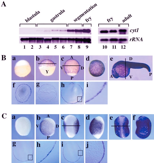 Fig. 2 The zebrafish cyt1 gene and the Xenopus XK81 gene are expressed in outer epithelial layers. A: Northern blot analysis of cyt1 expression. A cyt1 probe made from clone 1:4 (see Experimental Procedures section) was hybridized to Northern blots containing 1 μg of total RNA from various stages of development: Lane 1, 1-cell stage (3 hours postfertilization [hpf]); lane 2, sphere (4 hpf); lane 3, 50% epiboly (5 hpf); lane 4, 75% epiboly (8 hpf); lane 5, 90% epiboly (9 hpf); lane 6, tail bud (10 hpf); lane 7, 18 somites (18 hpf); lane 8, prim5 (24 hpf); lanes 9 and 10, long pec (48 hpf); lane 11, fry (1 week); lane 12, adult (3 month). Hybridization to a probe for 18S rRNA was used as a loading control. B: Whole-mount in situ hybridization analysis of cyt1 expression. A cyt1 probe (see Experimental Procedures section) was hybridized to zebrafish embryos from various stages: a, late blastula, sphere stage, 4 hpf; b, early gastrula, shield stage, 6 hpf; c, late gastrula, 85% epiboly, 9 hpf; d, mid-somitogenesis, 5-somite stage, 12 hpf; e, end of somitogenesis, prim 5, 24 hpf. Some embryos were sectioned after in situ hybridization to further define the expression of cyt1. f, section through embryo in b; g, section through embryo in c; h, section through embryo in e; i, enlargement of boxed region in h. The level of each section is indicated by a black line. Anterior is to the top in a–d and to the left in e. Dorsal is to the right in b–d and to the top in e. Dorsal cannot be assigned at the stage in a (sphere stage, 4 hpf). Dorsal is to the top in f–i. Y, yolk. C: Whole-mount in situ hybridization of XK81 expression. An XK81 probe (see Experimental Procedures section) was hybridized to Xenopus embryos from various stages; a and b, late gastrula, st. 12.5; c and d, mid-neurula, st. 15; e and f, tail bud, st. 20. Embryos were sectioned to further define XK81 expression: g, section through an early neurula stage embryo (st.14) at the level indicated in c; h, enlargement of area boxed in g; i, section through a late neurula stage embryo (st.18) at the level indicated in e; j, enlargement of boxed area in i. Anterior is to the top in a–f. a, c, and e are dorsal views. b, d, and f are lateral views. Dorsal is to the top in g–j. D, dorsal; V, ventral; A, anterior; P, posterior.