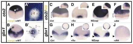 Fig. 2 The blastoderm margin is the source of signals important for otx2 and gbx1 expression. (A-B') Lateral blastoderm margin transplantations into the animal pole of a wild-type host embryo. (A,B) Embryo containing cells from the blastoderm margin derived from injected wild-type embryos with a lineage tracer (brown). (A) The white arrowhead indicates a clone of non-otx2-expressing cells in the otx2 domain of a transplanted embryo. (A') Close-up of the transplanted cells. otx2 is repressed around the transplanted cells. (B) The black arrowhead indicates a clone of gbx1-expressing cells in the otx2 domain. (B') Close-up of the transplanted cells. gbx1 expression is induced around the transplanted cells. (C-J) gbx1 and otx2 expression in the absence of FGF, Nodal or Wnt signaling at 60%. (C) Control embryo stained for otx2 and Ntl protein (brown). (D) In Su5402-treated embryos, otx2 is strongly reduced and expands up to the margin at the level of the midline. (E) In MZoep embryos, otx2 expands up to the margin at the level of the midline. (F) In dkk1-injected embryos (100 pg), a posterior shift of otx2 is visible laterally (compare brackets in C and F). (G) Control embryo stained for gbx1. gbx1 is expressed dorsolaterally and absent in the margin ventrally in Su5402-treated embryos (H). (I) In MZoep embryos, gbx1 expands up to the margin. (J) dkk1-injected embryos (100 pg) do not express gbx1, showing the Wnt-dependent activation of gbx1. The black arrowheads indicate the margin. (C-J) Dorsal views, anterior upwards; (C,D,E,F) right corner, lateral views, dorsal towards the right; (G-I) right corner, animal pole views, dorsal downwards.