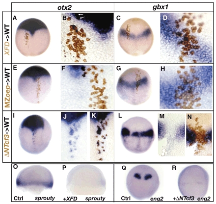 Fig. 3 Role of FGF, Nodal and Wnt signals in defining the otx2 and the gbx1-expression domain. (A-D) Embryo containing cells derived from injected embryos with a lineage tracer (brown) and XFD RNA (200 pg) stained for otx2 (A,B) or for gbx1 expression (C,D) at 90%. (B,D) Close-up of transplanted cells. XFD-transplanted cells (blind for FGF signaling) strictly follow the host otx2 expression domain or gbx1 expression domain. (E-H) Embryos containing cells derived from MZoep-injected embryos with a lineage tracer (brown) stained for otx2 (E,F) or for gbx1 expression (G,H) at 90%. (F,H) Close-up of transplanted cells. MZoep cells (blind for Nodal signaling) strictly follow the host otx2 expression domain or gbx1 expression domain. (I-N) Embryos containing cells derived from injected embryos with a lineage tracer (brown) and ΔNTcf3 RNA (400 pg). (I) Transplanted embryo stained for otx2. (J) Close-up of cells ectopically expressing otx2 followed by (K) staining the donor cells (brown). (L) Transplanted embryo stained for gbx1. (M) Close-up of the gap in the gbx1-expression domain followed by (N) staining the donor cells (brown). The ΔNTcf3-transplanted cells (blind for Wnt signaling) express otx2 ectopically and do not express gbx1. (O) Control embryo at 60% stained for sprouty4; (P) XFD-injected embryos do not express sprouty4, an FGF target gene. (Q) Control embryo at tailbud stained for eng2. (R) In ΔNTcf3-injected embryos, eng2 expression is strongly diminished. (A-R) Dorsal views, anterior upwards.