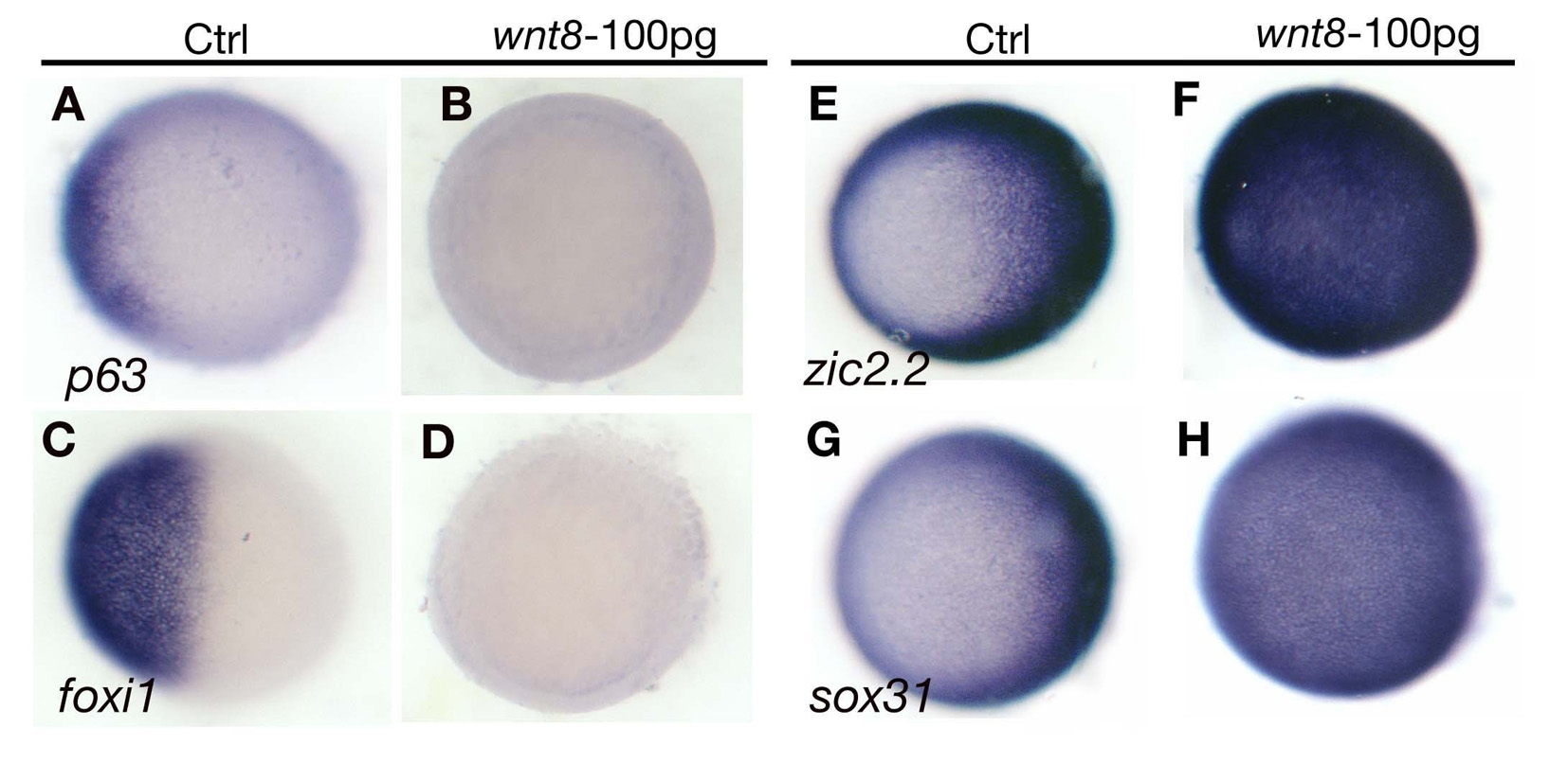 Fig. S1 Non-neural marker and pan-neural marker expression in Wnt8 gain-of-function experiments. Overexpression of wnt8 suppresses non-neural markers throughout the epiblast: (A) Control embryo and (B) injected embryos with wnt8 RNA 100 pg stained for p63 at 60% of epibloy. (C) Control embryo and (D) embryo injected with wnt8 RNA 100 pg stained for foxi1 at 60% of epibloy. Overexpression of wnt8 induces ectopic expression of neural markers throughout the epiblast. (E) Control embryo and (F) embryos injected with wnt8 RNA 100 pg stained for zic2.2 at 60% of epibloy. (G) Control embryo and (H) embryos injected with wnt8 RNA 100 pg stained for sox31 at 60% of epibloy. See also Fig. 6 for a similar analysis carried out using clones of wnt8 misexpressing cells.
