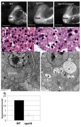 Fig. 5 Mutation of vps18 results in vesicle accumulation and lysosome depletion in hepatocytes. (A) hi2499A mutants and vps18 morphants develop hepatomegaly. Scale bar: 100 µm. (B-D) Hematoxylin and Eosin staining of day 5 wild-type (B) and vps18 mutant (C,D) livers. Hepatocytes in mutant embryos are large and accumulate vacuoles (arrows in D). Boxed area in C is enlarged in D. Scale bar: 5 µm. (E,F) TEM of day 5 wild-type (E) and vps18 (F) hepatocytes shows large, membrane-bound structures proteinacious material and debris, indicative of vacuoles (v) in the mutants. n, nucleus. (G) vps18 mutation reduces the number of lysosomes in hepatocytes. Error bars indicate standard error of the mean.