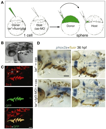 Fig. 4 Pharyngeal pouch restoration is sufficient for rescuing phox2a-positive EB neurons. (A) Donor embryos were injected with a tar* mRNA and a lineage tracer (fluorescein or gfp), while host embryos were injected with cas morpholino. At sphere stage, 10-20 tar*-positive cells were transplanted to the margin of cas hosts and mosaic embryos were collected at 36 hpf. (B) Side view of the live cas-MO embryos that received tar* transplant. Arrows indicate endodermal pouches. (C) Lateral views of a cas host embryo that received tar*+gfp transplant. Zn-5 (red, top) and GFP (green, middle) were detected by immunolabeling. Note that tar*-positive cells efficiently rescue endodermal pouches (yellow overlay, bottom). (D) Side (left) and ventral (right) views of cas hosts that received tar*+fluorescein transplant with (bottom) or without (top) fgf3-MO1. Resulting embryos were processed to detect phox2a expression (blue) and fluorescein (brown) at 36 hpf. Note rescue of the glossopharyngeal and facial ganglia (arrows) in the embryos that did not receive fgf3-MO1 (top). By contrast, fgf3-MO1 tar*-transplanted cells failed to rescue EB ganglia (bottom). Scale bars: 50 µm. Abbreviations are as in Fig. 1.