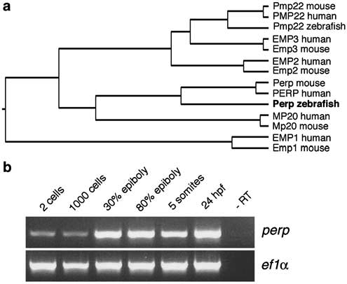 Fig. 1 Zebrafish Perp is a member of the PMP22 family and expressed throughout zebrafish development. (a) Phylogenetic tree between different zebrafish, mouse and human members of the PMP22 family, assembled by the Jotun Hein method (DNASTAR Inc.), revealing that the zebrafish protein encoded by cloned cDNA is the Perp ortholog. (b) Semiquantitative RT-PCR analysis of zebrafish perp expression during embryonic development. As control, transcripts of the ef1α housekeeping gene19 were amplified. perp transcripts can be detected during all investigated stages, indicating maternal and zygotic expression of the perp gene