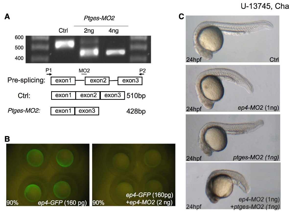 Sup. Fig. 2 Morpholinos against ptges and ep4 transcripts are effective and demonstrate synergism. (A) RT-PCR analyses of ptges transcripts from total RNA isolated from 15 embryos in uninjected control (ctrl), 2ng of ptges-MO2 injected, and 4ng of ptges-MO2 injected embryos. Diagram demonstrates the loss of exon2 in ptges-MO2 injected embryos due to blocking of splicing acceptor site. This results in alternative splicing from the splicing donor site at the end of exon1 and acceptor site in the beginning of exon3. This was verified by sequencing of the 428bp band. (B) Images of embryos overexpressing GFP-tagged EP4 receptor injected with ep4-gfp RNA alone or co-injected with ep4-MO2. (C) ep4- and ptges-MO reveal synergism at sub-optimal doses. Injection of ep4- or ptges-MO at 1ng cause mild shortening of zebrafish length at 24 hpf. However co-injection of ep4- and ptges-MO at 1ng results in synergistic effect on the length of zebrafish embryos at 24 hpf.