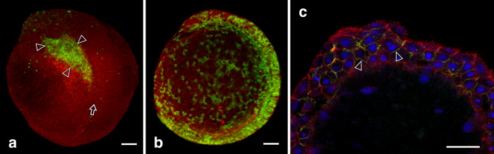 Fig. 2 Ectopic expression of tagged Pcdh10 in zebrafish embryos. Single blastomeres of eight-cell embryos were injected with an RNA of GFP-tagged Pcdh10 construct, Pcdh10G. a: Confocal microscopy of 11 hours postfertilization (hpf) embryos expressing Pcdh10G revealed that fluorescent cells remained coherent during gastrulation to form patches (arrowheads) on the embryo. In this particular embryo, the left segmental plate was split from the notochord (arrow) at such a patch of green cells. GFP image (green) was superimposed on a phalloidin image (red). Left-side oblique view with rostral to the top. b: Confocal image of a 11 hpf embryo injected with GFP control RNA showed green cells dispersed over the embryo. Left-side view with rostral to the top. c: Detailed confocal scan of a 9 hpf embryo showing Pcdh10G localized to the cell peripheries (green, arrowheads). Red, phalloidin; blue, 4,6-diamidino-2-phenylindole (DAPI). The animal pole is to the top, dorsal to the right. a and b, Z projections of serial optical sections. c, a single section. Scale bars = 50 μ m.