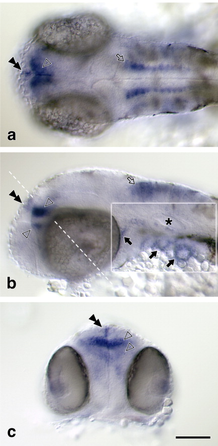Fig. 6 pchd10 expression in the rostral structures. pcdh10 was expressed in the epiphysis (double arrowheads), diencephalon (arrowheads), myelencephalon (open arrows), otocyst (asterisk), eye muscles (closed arrow), and fin buds (closed arrows). a-c: Dorsal (a), lateral (b), and frontal (c) views of 33-hours postfertilization (hpf) embryos stained by whole-mount in situ hybridization for pcdh10. The dashed line in b indicates the focal plane of c. The focal plane of the inset in b is lateral to that outside the inset. Scale bar = 100 μm.